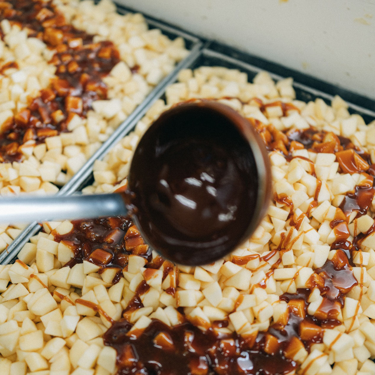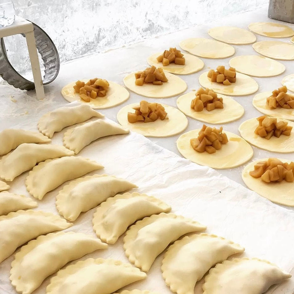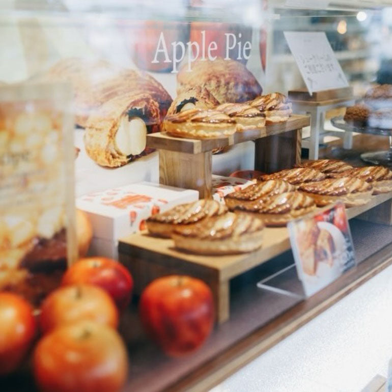 とある日、売れ残ったアップルパイを破棄するのがもったいなく、シュークリーム用のカスタードクリームを何気なく詰め、スタッフのまかないとして食べて頂きました。すると、全スタッフより「美味しいい!」という声があがり、それをきっかけに翌日より商品化しました。
