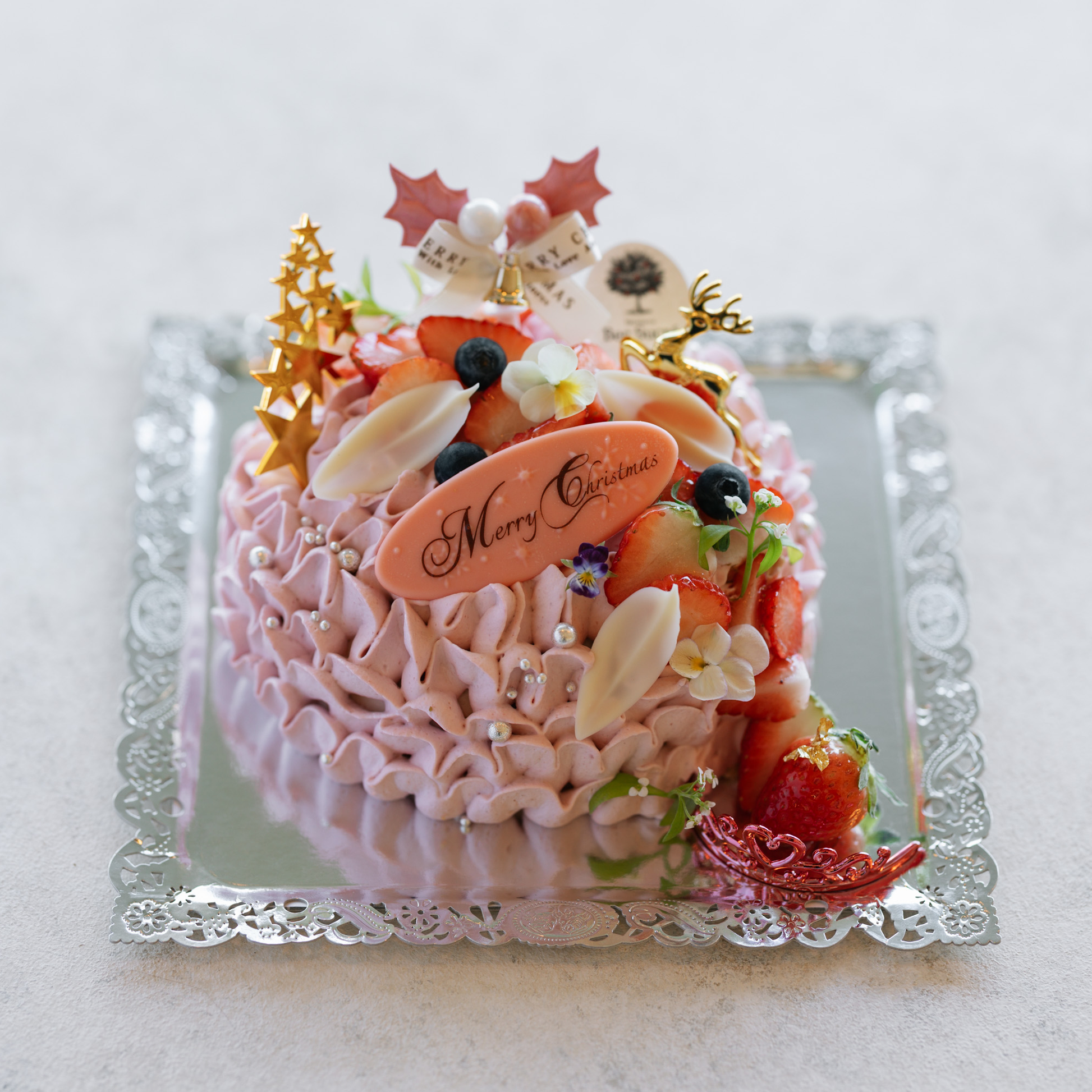 スポンジと苺で作るドーム型ショートケーキがベース。木苺風味のピンクのクリームをふりふりにデコレーションした初登場のクリスマスケーキ。