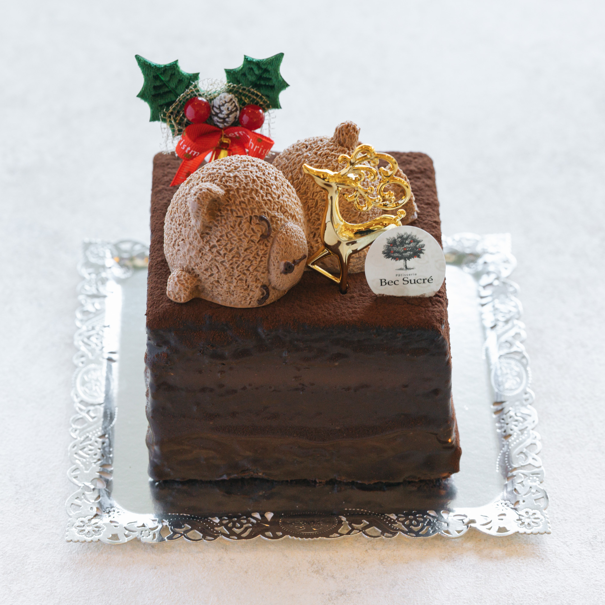 「石畳」を意味するパヴェ。人気のチョコレートケーキに寝ているくまさん(ムースショコラ)をデコレーション。